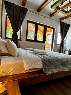 Camera Alpine View evoca privelistile vaste și deschise ale orizontului montan, sugerand un loc de refugiu și liniste. Patul mare, din lemn masiv, completeaza cu succes panorama montana ce-ti taie rasuflarea. Camera are acces la o terasa spatioasa, cu hamac pentru o persoana si un fotoliu Adirondack. Privelistea asupra lacului Belis si a masivului Vladeasa este absolut incantatoare.